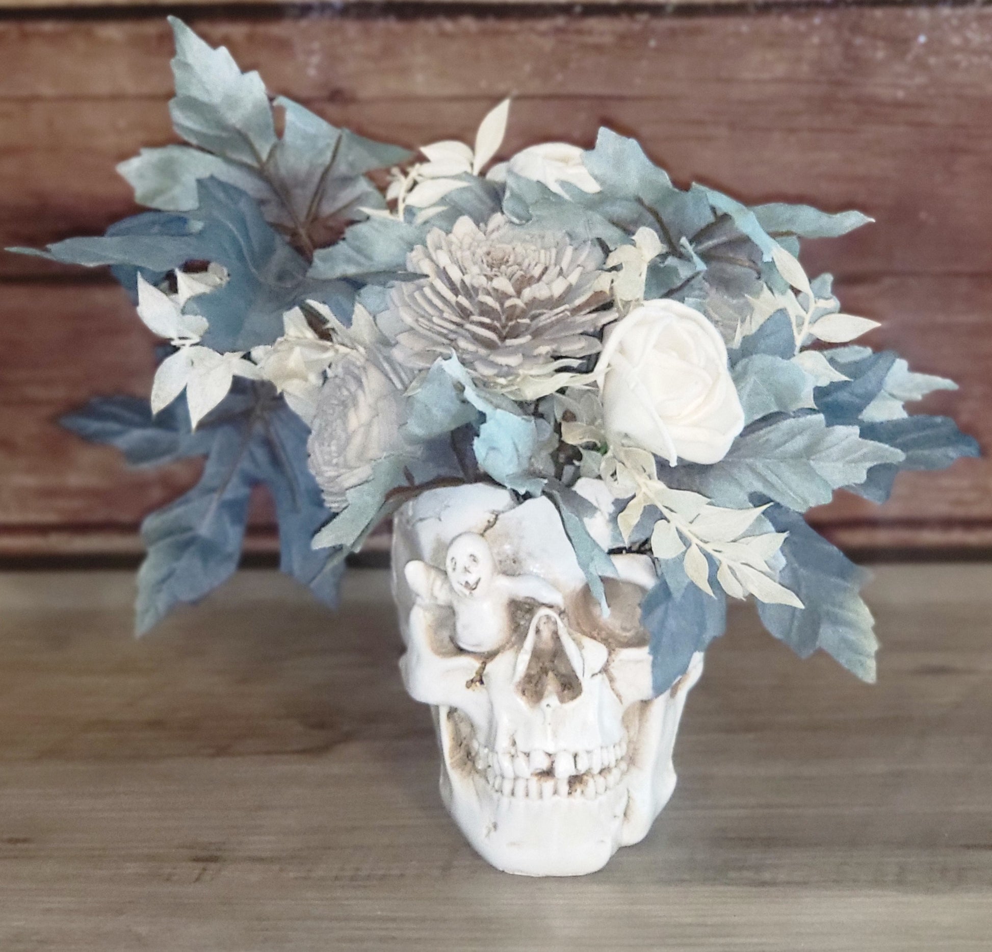 A striking fusion of eerie and elegant, the Eternal Bloom Skull Arrangement transforms the macabre into timeless beauty. Nestled in a detailed skull vessel, soft ivory roses, pine-inspired blooms, and sage-toned foliage spill outward in haunting harmony. Each flower, hand-crafted from sola wood, carries a lifelike texture that contrasts beautifully against the rustic skull base. Subtle ghostly accents add a playful Halloween spirit without sacrificing sophistication.