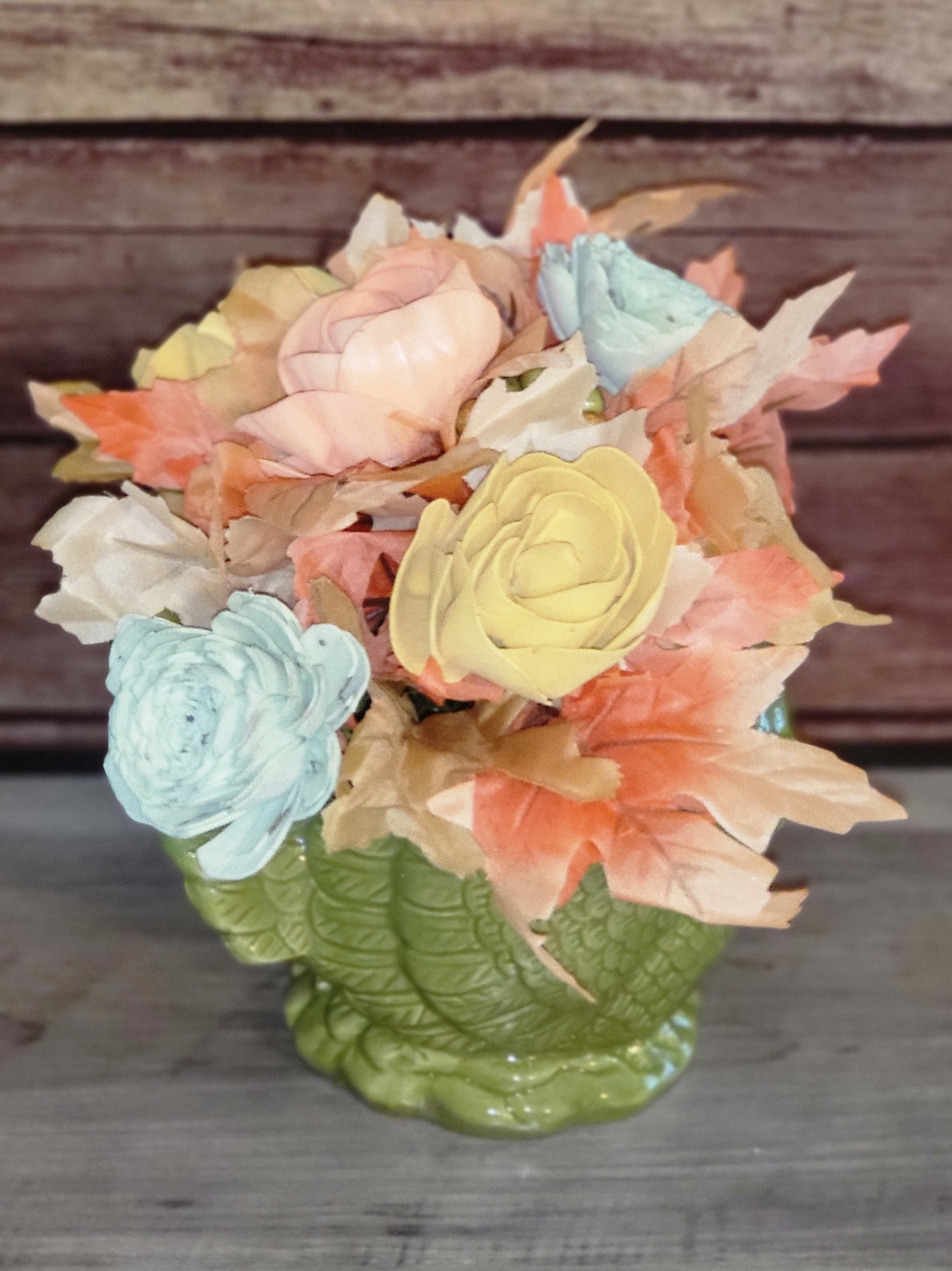 Celebrate the warmth of the season with the Govvle & Gather Arrangement. This charming piece features a ceramic green turkey vase filled with hand-painted sola wood flowers in soft autumn shades of golden yellow, blush peach, and light green. Accented with crisp fall leaves in oranges and creams, this arrangement brings a cozy, festive touch to your Thanksgiving table or fall décor.